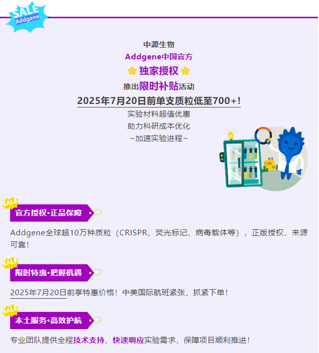 九体育网(中国一站式服务官网 Addgene中国官方 ⭐独家授权⭐ 推出限时补贴活动 2025年7月20日前单支质粒低至700+!实验材料超值优惠 助力科研成本...2025-05-16 09:24:00.0