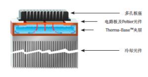 LightCycler480Ⅱ热循环模块的横截面图。Therma-BaseTM是一个内壁布满灯芯状毛细管结构的腔体,以有效增大接触表面积。通过一系列实时冷凝和蒸发效应,高效传递热量,从而实现整板优秀的温度均一性。