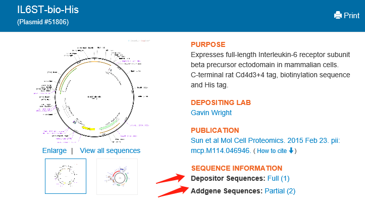 进入相关质粒页面后,可以看到在质粒图谱的右侧有三个黄色标题,其中最后一个标题:Sequence Information,即为质粒序列相关信息。Depositor Sequences为质粒原始持有人上传给Addgene的序列,Partial是指该作者上传序列时只提货了一部分序列信息;Addgene Sequences为Addgene对质粒进行的测序结果。Full是指Addgene提供了质粒的全部序列信息。点击相关链接后,可进入具体的序列页面。