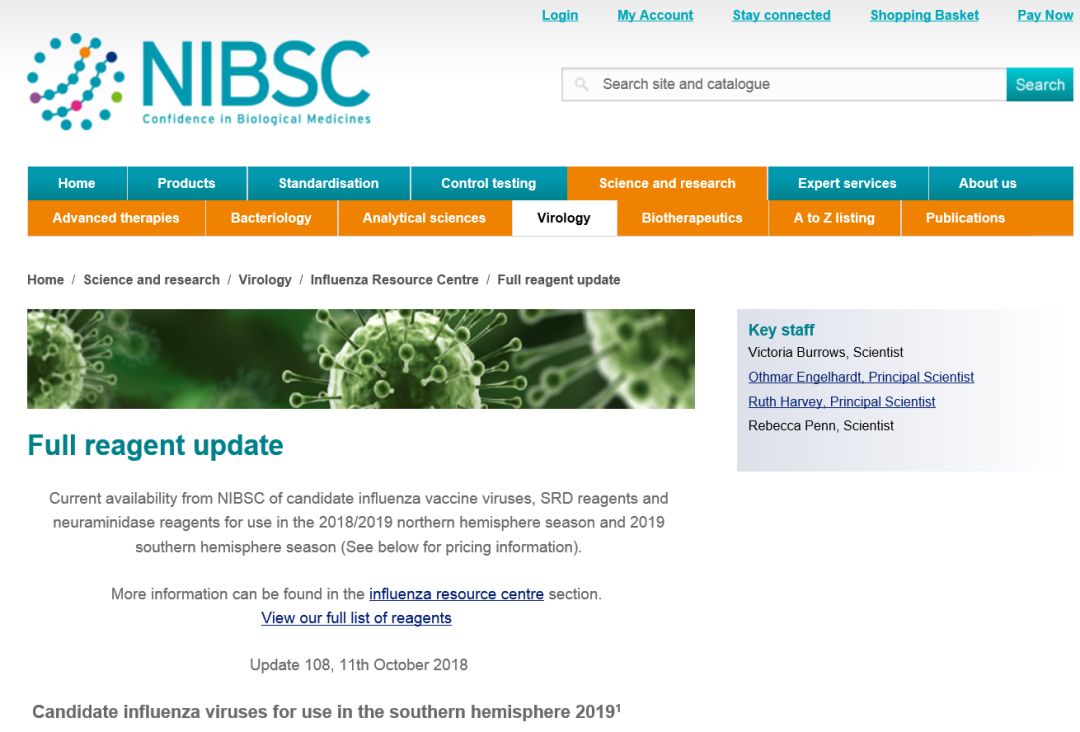 前NIBSC可提供2018/2019年北半球季节和2019年南半球季节使用的候选流感疫苗病毒、SRD试剂和神经氨酸酶试剂。近期NIBSC更新了南半球2019年候选流感病毒,以下是NIBSC的网址,请您查阅。