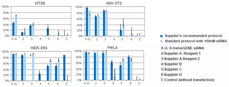 图4. X-tremeGENE siRNA Transfection Reagent用于4种细胞系的HPRT基因沉默实验。根据各试剂说明书建议的操作流程,或标准实验方法,将100nM HPRT特异性siRNA转染至4种细胞。 通过LightCycler® h-HPRT Housekeeping Gene Set的荧光定量法评估基因沉默效率。结果显示X-tremeGENE siRNA Transfection Reagent在四种细胞中转染后基因沉默表现均表现优异。