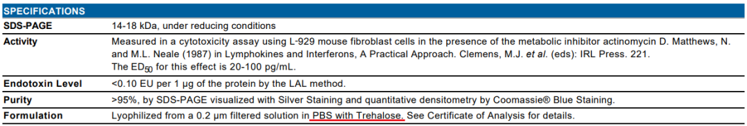 答案就在说明书 Formulation 那一栏里,我们在蛋白中添加了海藻糖。海藻糖是一种以两个葡萄糖分子通过 α,α,1,1-糖苷键连接的二糖。海藻糖是一种非还原糖,不与氨基酸或蛋白质发生反应。